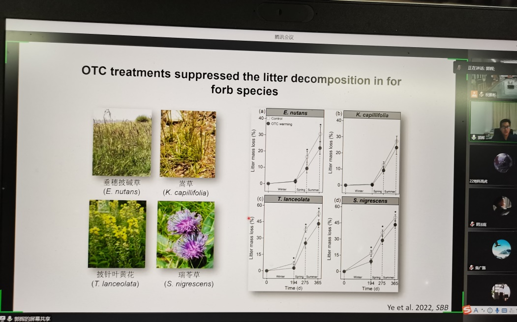 郭教授介绍了全球变化背景下有关植物物种多样性、生物量等研究的相关背景知识,介绍了在甘南藏族自治州国家高寒草地生态系统野外监测站设置的多因子试验的概况,着重分析了氮富集、增温和减雨对植被-土壤功能过程及其协同关系的影响,并且分析了该研究方向的科研热点和未来发展趋势,让公司师生对全球变化背景下植被物种多样性、生物量的变化特征及驱动机制有了更深的认识。
