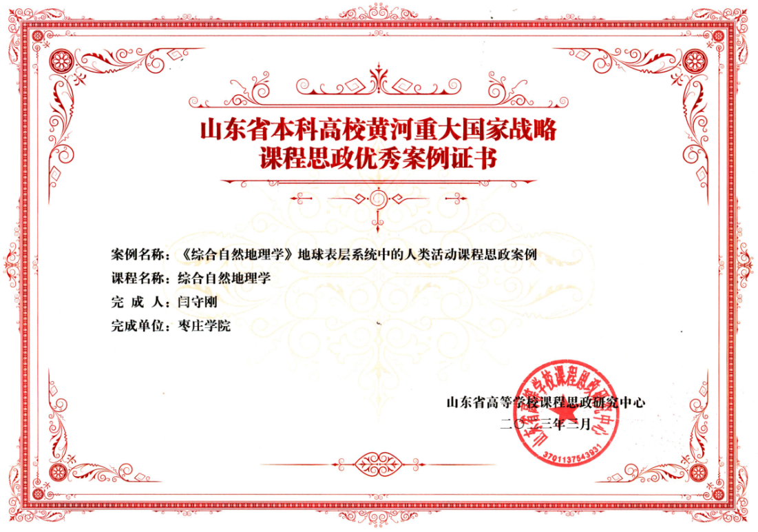 近日,山东省高等公司课程思政研究中心公布了“山东省本科高校黄河重大国家战略课程思政优秀案例”名单。2138cc太阳集团官网入口共有6项案例入选,公司闫守刚副教授依托《综合自然地理学》课程申报的教学案例《地球表层系统中的人类活动课程思政案例》成功入选。