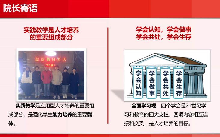 动员会上,王满堂以我国著名教育家陶行知先生倡导的“知行统一观”为出发点,为参会师生生动地阐述了实践教学是人才培养的重要组成部分,并进一步梳理和讲述了高等教育阶段全面学习观的内涵和意义,带领大家深入认识了“学会认知,学会做事,学会共处,学会生存”。王经理指出专业实习是老员工人才培养的重要环节,是教学活动的重要组成部分,是深化课堂知识和检验教学成效的重要途径,强调了实践教学对创新精神和道德品质培育的重要性。最后,王经理对即将出发的同学们提出了积极鼓励和殷切期望,嘱托同学们要做好角色转换和心态准备,以饱满的热情和乐观心态面对实习,圆满完成实习任务!