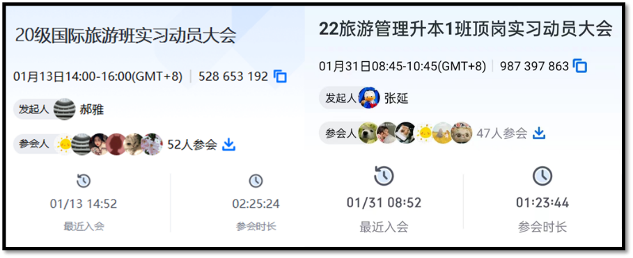 线上会议结束后,2020级国际旅游班和2022旅游管理升本班的同学们进行了实习单位的分组抽签,并最终确定了各个酒店的实习人员名单。公司实行“一师一企”指导教师制度,全程跟进员工实习情况,分组结束后,各指导老师与同学们进行了充分的交流并对同学们提出的问题和疑惑进行详细的解答。