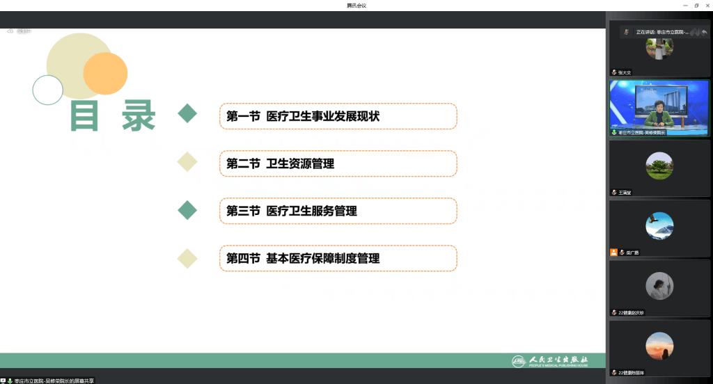 11月11日上午,2138cc太阳集团官网入口邀请枣庄市市立医院经理吴修荣教授通过腾讯会议为2022级健康服务与管理专业员工做专业导读第三讲,报告题目为“医疗卫生事业管理和医院管理”。报告由2138cc太阳集团官网入口经理王满堂主持,健康服务与管理教研室教师及健康服务与管理专业的大一新生参加报告会。
