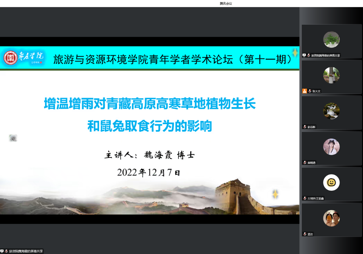 报告会上,魏海霞博士作了题为“增温增雨对青藏高原高寒草地植物生长和鼠兔取食行为的影响”的学术报告,介绍了不同增温增雨处理对植物生长和鼠兔取食行为的影响。研究发现,增温显著降低了植物的生长和促进了鼠兔取食行为,从而对高寒草地植物的生长有一个净的负影响;增雨显著提高了植物的生长和降低了鼠兔啃食强度,从而对高寒草地植物的生长有一个净的正影响。该研究揭示2℃增温对植物生长的负影响在15%增雨下可被消除,这一发现对预测未来气候变化下高寒草地的变化趋势具有重要意义。