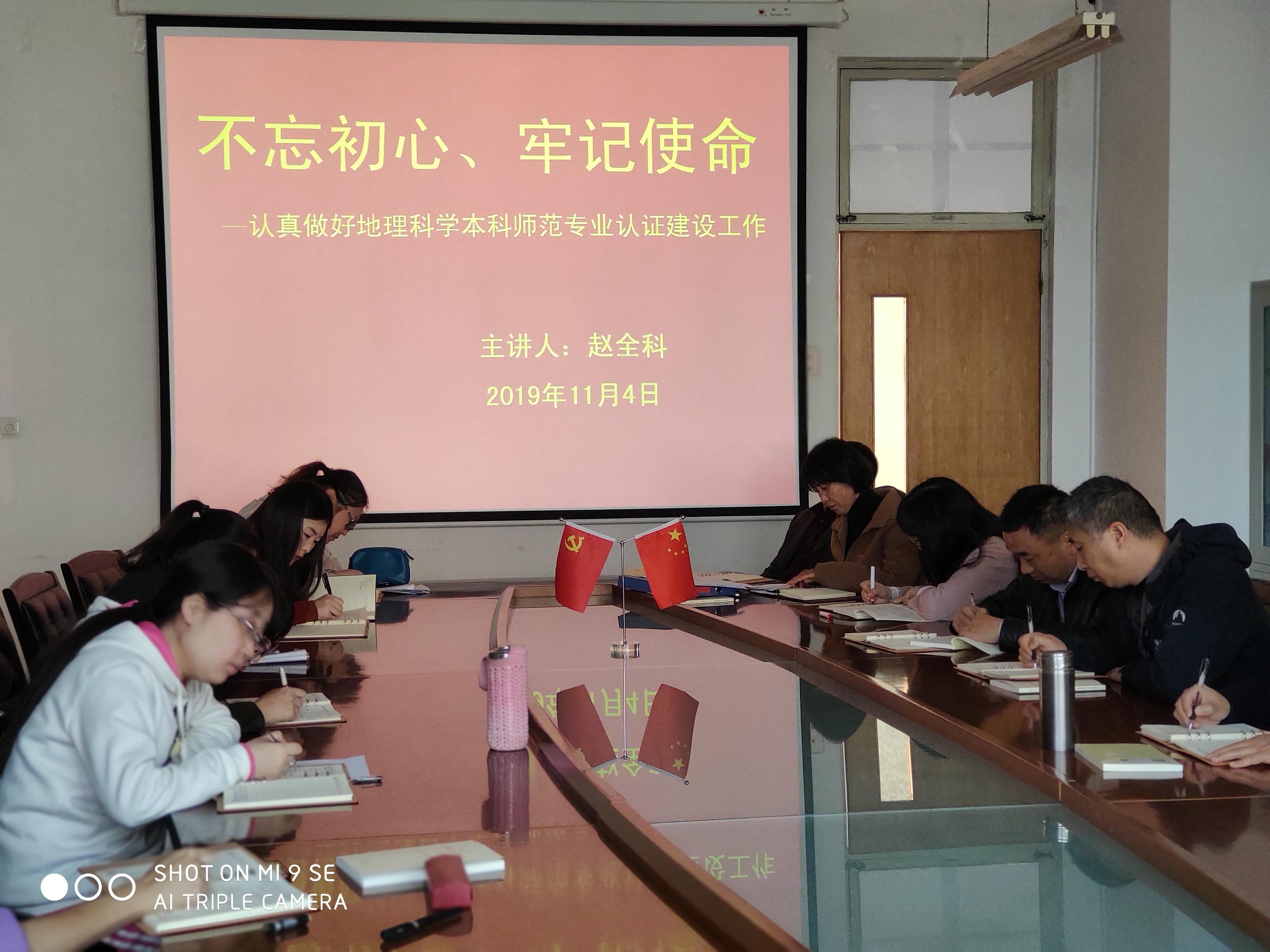 按照公司“不忘初心、牢记使命”主题教育工作部署与要求,11月4日下午,2138cc太阳集团官网入口在理工楼2514会议室开展主题教育专题党课活动,经理赵全科讲了题为《不忘初心 、牢记使命—认真做好地理科学本科师范专业认证建设工作》的党课,全体党员聆听了党课。