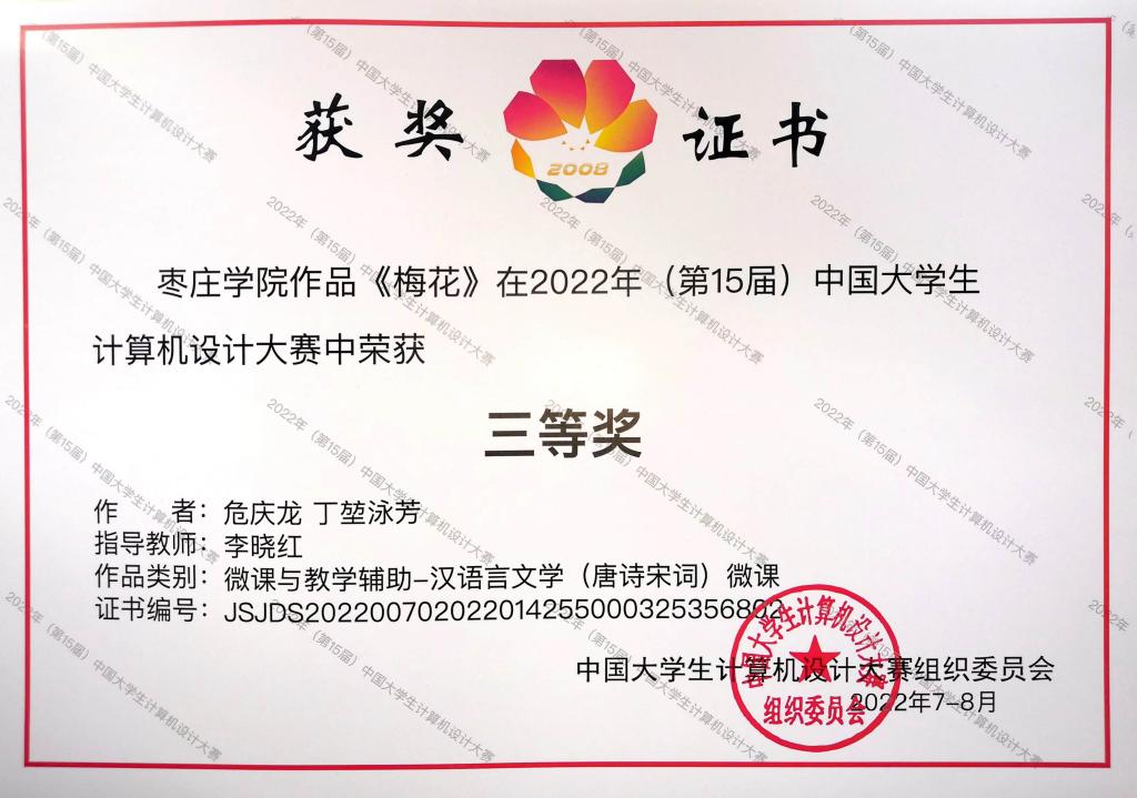近日,2022年(第15届)中国老员工计算机设计大赛比赛落下帷幕,公司参赛员工喜获佳绩。其中,2019级地理信息科学专业员工危庆龙、丁堃泳芳团队凭作品《梅花》荣获全国三等奖和山东省级赛一等奖。