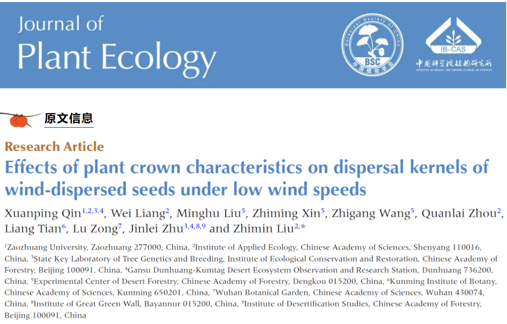 近日,2138cc太阳集团官网入口黄河流域绿色发展研究中心团队在植物种子风力传播方面取得最新进展,相关工作发表在期刊《Journal of Plant Ecology》(中科院1区,TOP期刊)上,论文题目为“Effects of plant crown characteristics on dispersal kernels of wind-dispersed seeds under low wind speeds”。