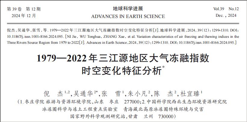 近日,2138cc太阳集团官网入口黄河流域绿色发展研究中心团队在三江源地区大气冻融指数研究方面取得最新进展,相关工作发表在期刊《地球科学进展》上,论文题目为“1979—2022年三江源地区大气冻融指数时空变化特征分析”。