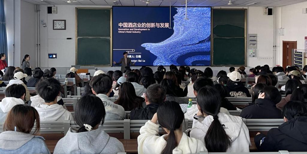 白璐以“中国酒店业的创新与发展”为题,从中国旅游业宏观背景、科技赋能酒店业创新、文化增值打造差异化、绿色可持续实践、人才引擎驱动未来等方面进行介绍,并结合当前旅游专业的就业现状,为同学们的学习及未来就业指明了方向。