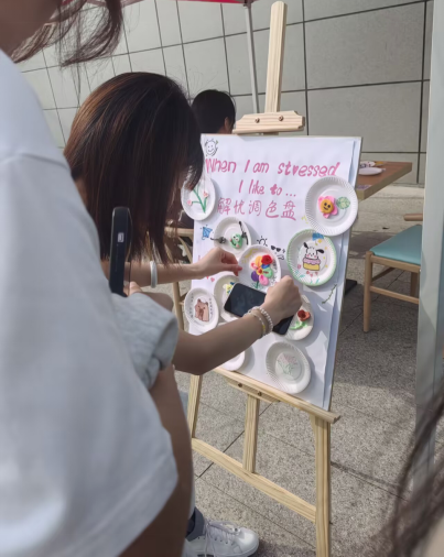 公司心理志愿者提前在莲花餐厅门口备妥丰富物料,包括画笔、马克笔、画纸、调色盘、彩泥、不同颜色的颜料等绘画工具,还准备了便签纸,供同学们写下自己的情绪或绘制图案。志愿者向参与同学讲解活动规则:同学们可根据自身当下的情绪状态,选取对应色彩的工具,通过线条、图案、色块等形式自由创作,将无形的情绪转化为有形的艺术作品。创作过程中,同学们沉浸其中,或用明亮的暖色调勾勒愉悦心境,或用柔和的冷色调抒发细腻思绪,或通过丰富的色彩碰撞释放内心压力。志愿者们在现场全程陪伴,主动与有需要的同学交流创作思路,倾听其情绪表达,给予积极的心理引导。