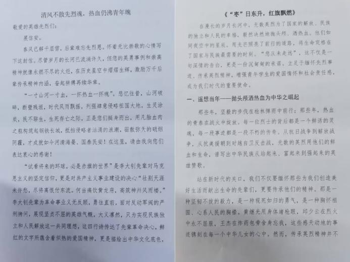 活动期间,参赛选手们紧扣主题,围绕个人成长、国家发展、民族复兴等多个角度,或讲述在中国共产党领导下为强国建设、民族复兴团结奋斗的红色故事;或通过回首家乡的发展轨迹,将目光聚焦于新中国成立以来取得的辉煌成就,以小见大彰显祖国发展给人民生活带来的天翻地覆的改变;或结合自身成长经历,畅谈对于以中国式现代化全面推进中华民族伟大复兴的心得体会,字里行间流露出同学们对祖国繁荣昌盛的自豪和对美好明天的坚定信心与无限憧憬,以及对党和国家的无限感激和热爱。在作品征集阶段,共收到来自全校的436篇参赛作品。经过评委们严格而公正的评审流程,最终评选出一等奖1名、二等奖2名、三等奖3名,以及优秀奖若干名。