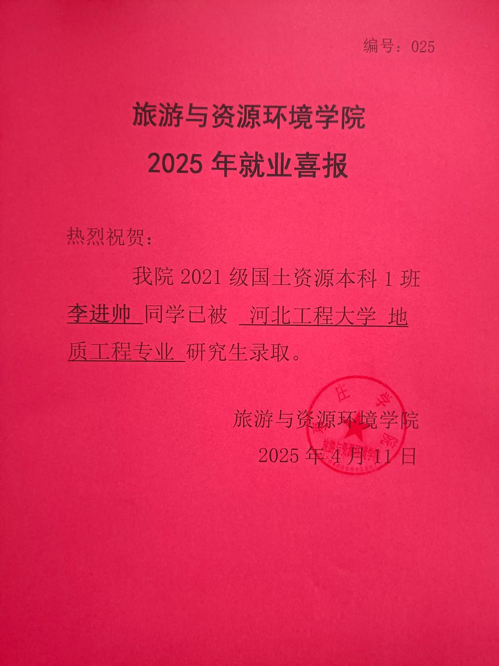 喜报!21国土资源本科1班李进帅被河北工程大学录取!